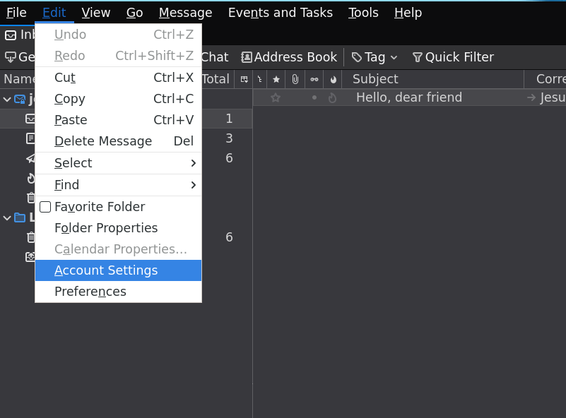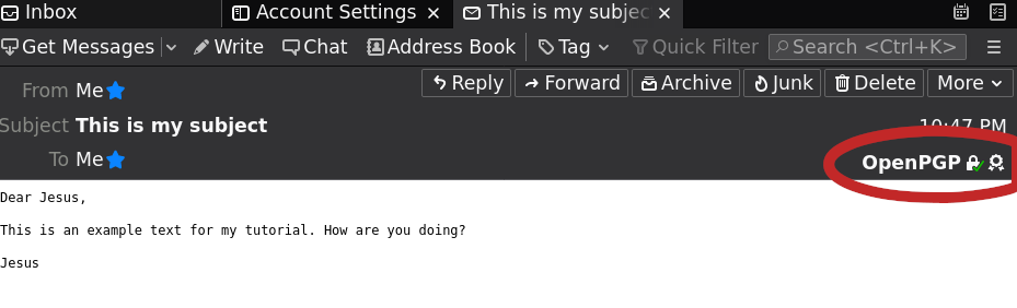 So let us set up our mail client to encrypt and decrypt mail with our newly acquired cryptographic skills. At this point, I am assuming that you use some sort of email client such as Thunderbird. I sincerely hope you do not access your mail through some webclient. I don't know if some webclients support PGP encryption, but I hope they don't (would you trust giving your private key to Gmail to keep it for you?).
