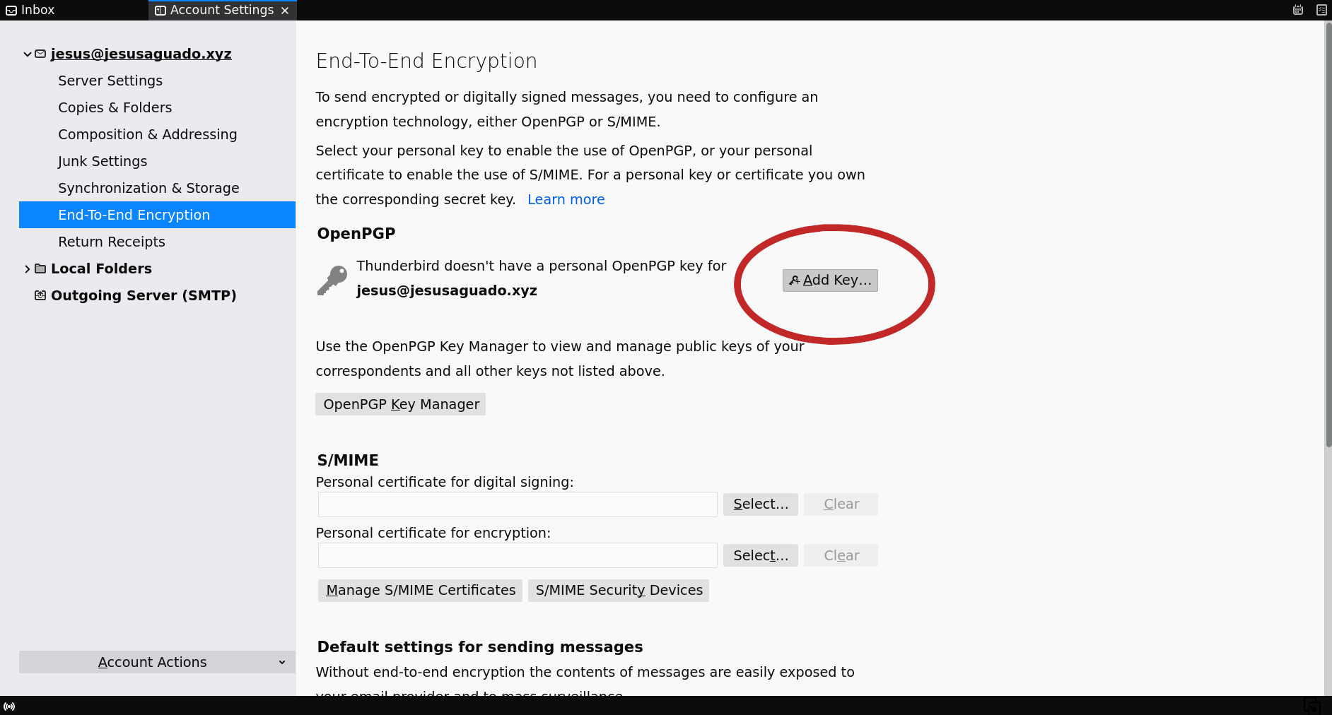 Now, go to Thunderbird back again and look for Account Setings > jesus@jesusaguado.xyz > End-To-End Encryption > Add