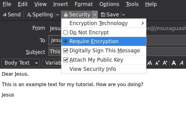 Once that is done, I can compose and encrypt an email (in this example I will be sending it to myself instead). I just need to tell Thunderbird to please encrypt it in the drop-down menu Security, and selecting Require Encryption. Thunderbird will not allow you to do this unless you have the recipient's public key. By default Thunderbird will also sign the message and attach your own public key, which is useful for the first communication.